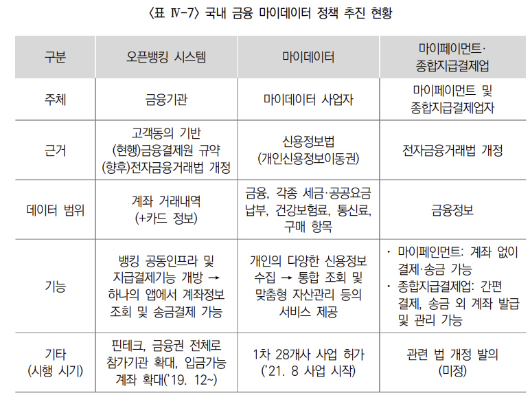 - 오픈뱅킹 시스템, 마이데이터, 마이페이먼트/종합지급결제업 비교