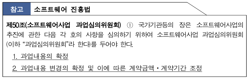 상용SW 직접구매 제외대상 여부, SW영향평가 재평가에 대한 과업내용을 심의합니다.
