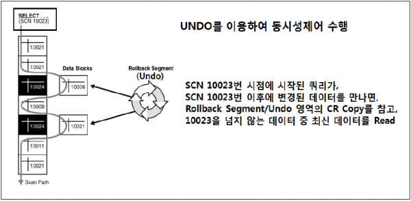 - 데이터를 읽다가 트랜잭션 시작 시점 이후에 변경된 값을 발견하면, UNDO 영역에 저장된 정보를 이용해 트랜잭션 시작 시점의 일관성 있는 버전(CR Copy)를 사용