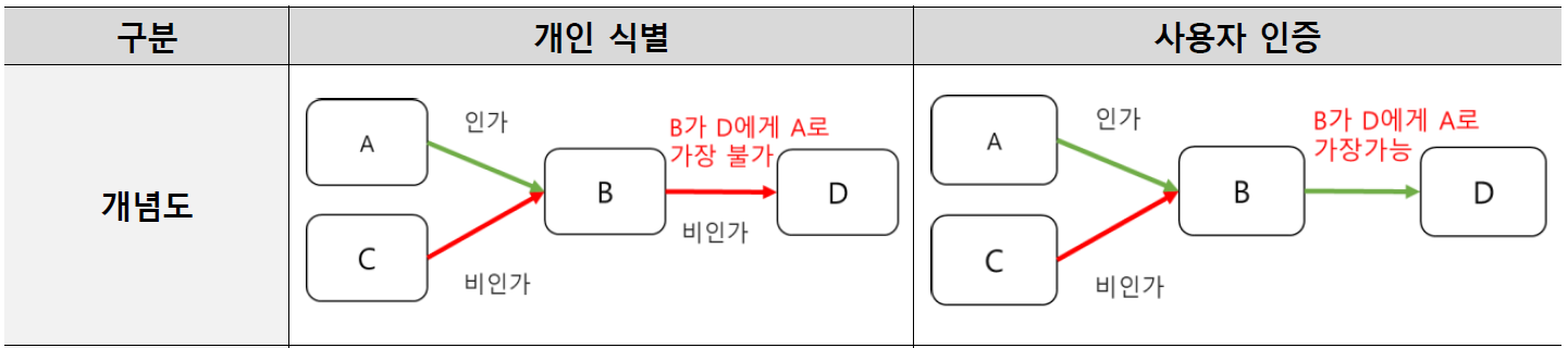 1. 사용자 인증 과 개인식별 정당한 가입자의 접속인지를 확인하기 위한 용도이다. 개인 식별: 사용자 B가 제 3자(D)에게 사용자 A로 가장할 수 없는 경우이다.(사용자 인증과 다른 개념) 2. 지식
