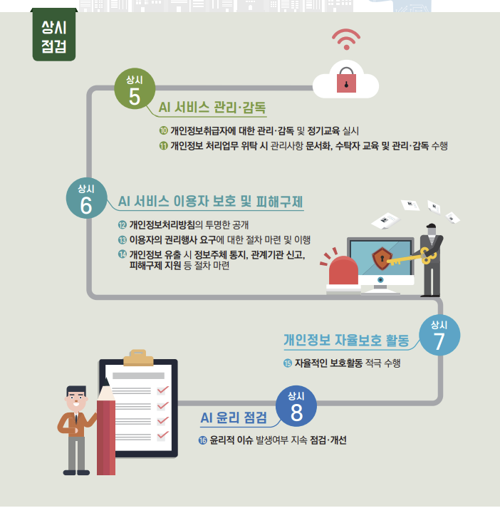 이를 대응하기 위하여, 최근 개인정보보호위원회에서 인공지능(AI)개인정보 보호 자율점검표를 확정하였다.