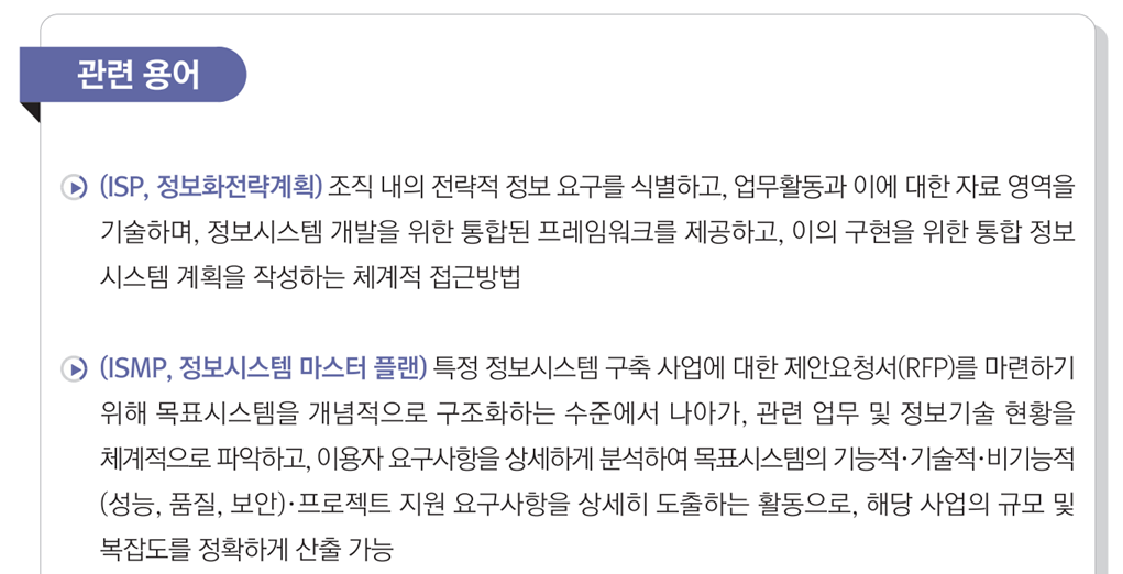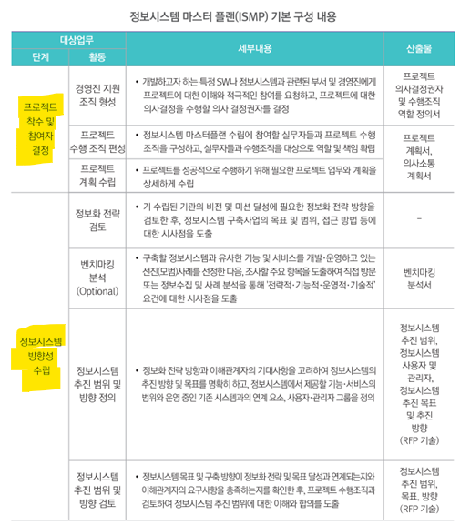 대부분 공공부문 소프트웨어 산업에 ISMP(Information System Master Plan)를 적용하고있다.
