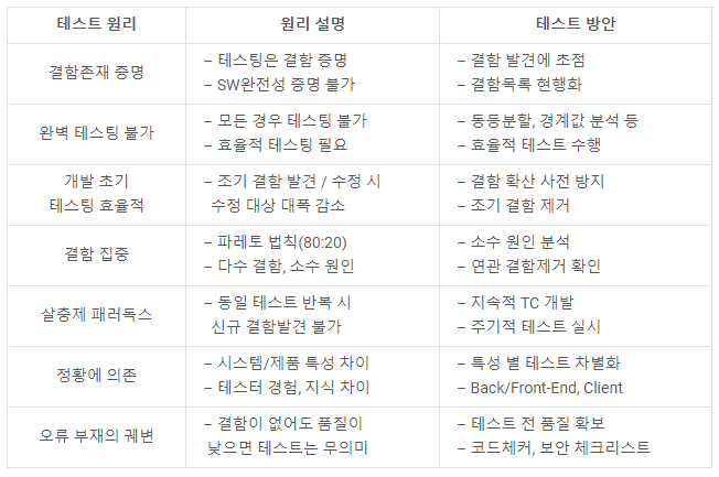 결함이 존재, 완벽한 테스팅 불가능, 초기에 테스트 시작, 결함 집중