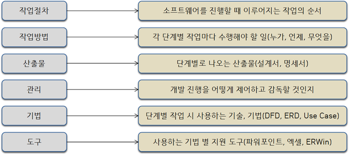 소프트웨어 개발 과정, 절차, 방법, 산출물, 기법, 도구들을 체계적으로 정리하고 표준화시킨 것