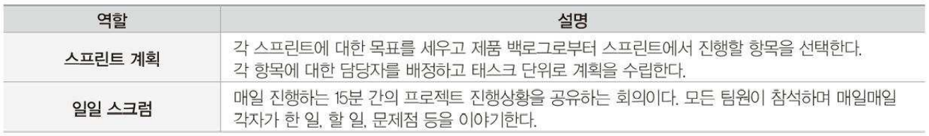 - 일일 스크럼 회의와 30일 단위의 스프린트를 이용하여 유연한 개발을 추구하는 애자일 방법론