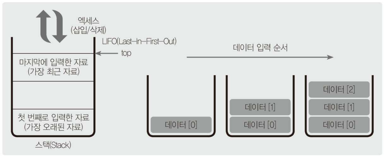 가장 나중에 쌓인 데이터가 가장 먼저 출력을 하게 되는 자료 구조