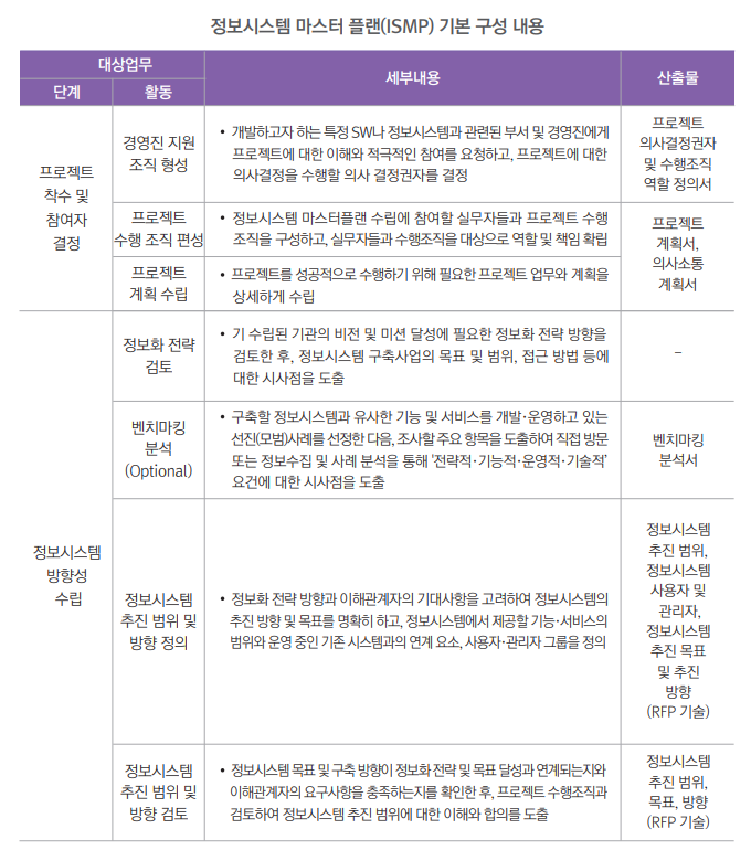 정보시스템 마스터 플랜(ISMP)의 기본 구성 내용 (단계별 활동, 세부내용, 산출물)