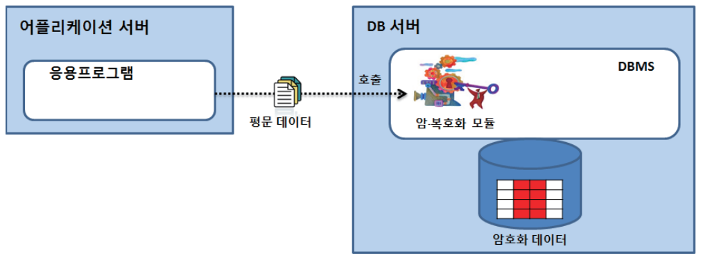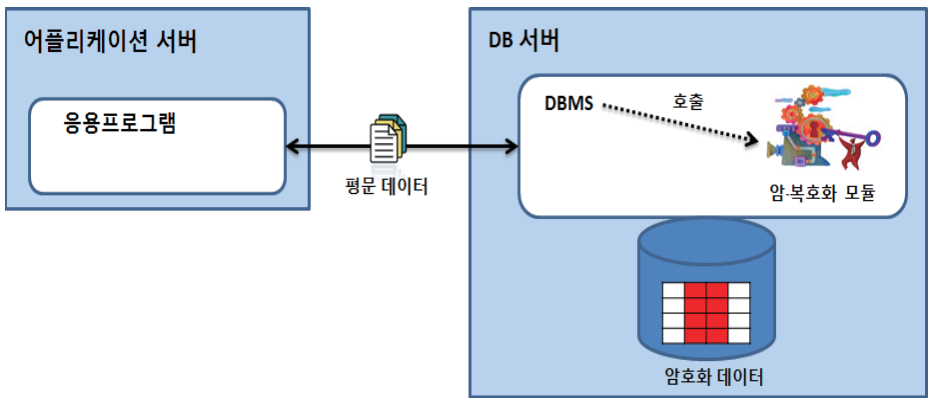 | DB 서버 암호화 방식 | 암 · 복호화 모듈이 DB 서버에 설치되고 DBMS에서 플러그인(Plug-in)으로 연결된 암 · 복호화 모듈을 호출하는 방식 |