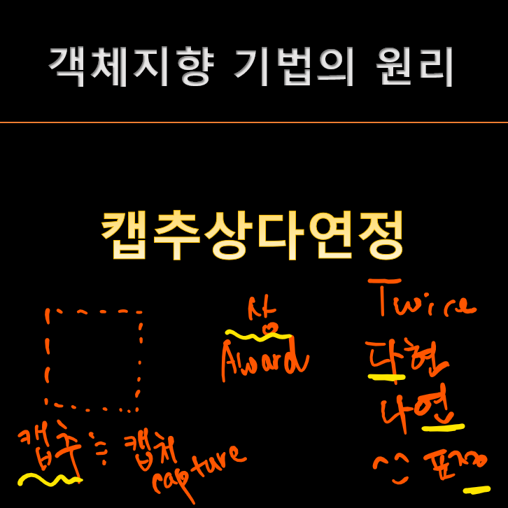 | 캡슐화 | 객체의 상세 내용을 객체 외부에 숨기고, 메시지만으로 객체와의 상호작용을 하게 하는 것 |