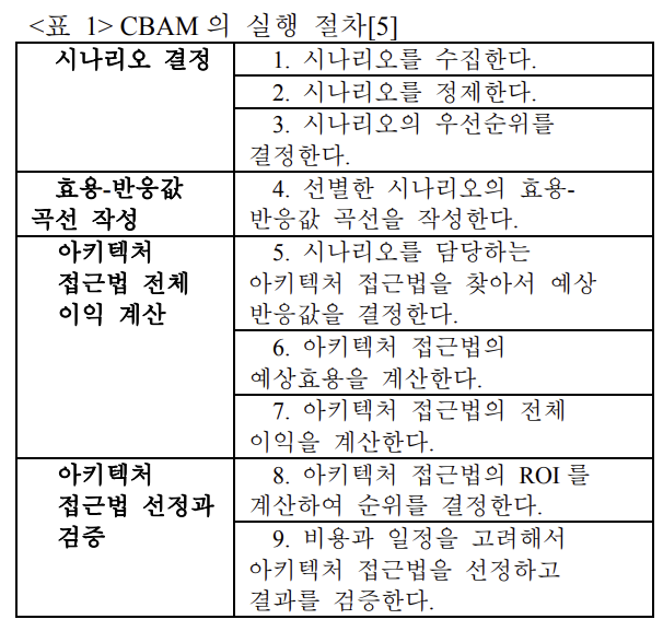 | CBAM | Cost Benefit Analysis Method | 의사결정 요구 충족, ATAM바탕 분석 |